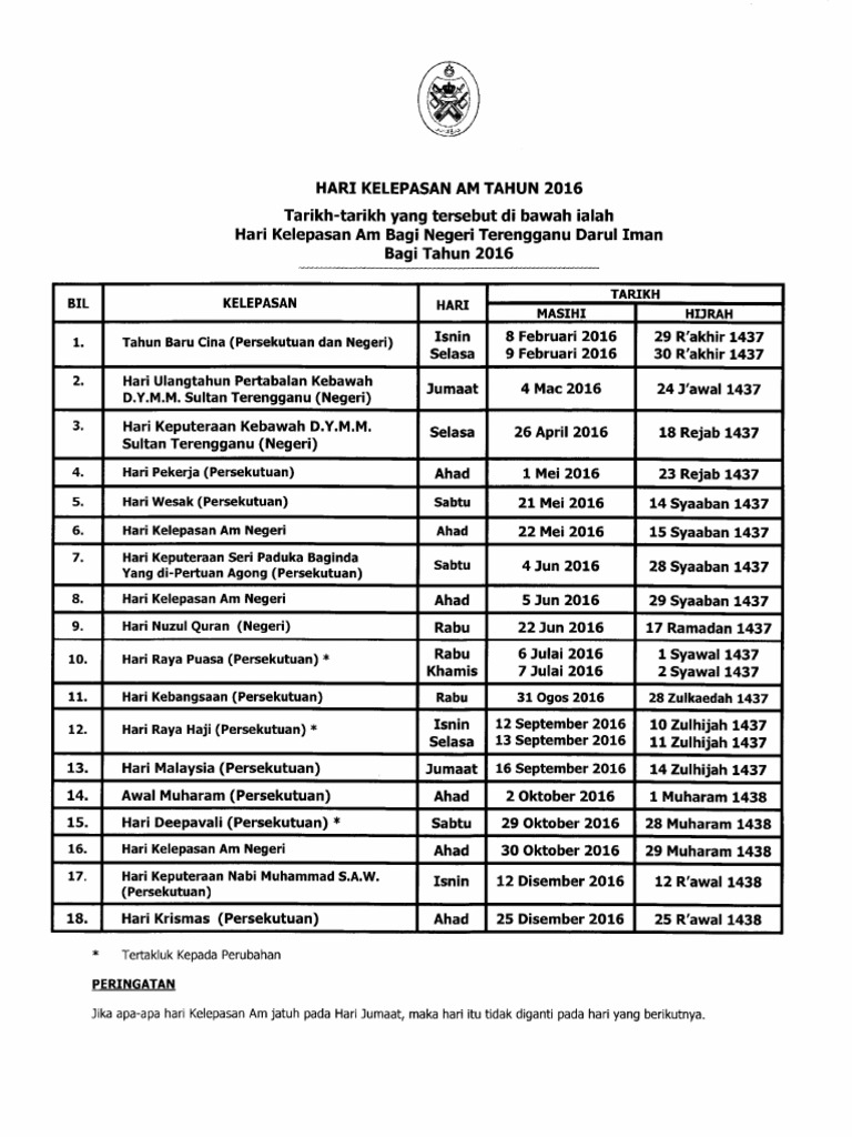 Hari Kelepasan Am from www.kabinet.gov.my Hari ulang tahun pertabalan sultan terengganu. Haritarikhhari kelepasan am bahagian kabinet, perlembagaan dan perhubungan antara kerajaan, jabatan perdana menteri, aras 4 timur, bangunan perdana putra, 62502 putrajaya jadual hari kelepasan am persekutuan 2018 bil jumaat √ √ √ √ √ √ √ √ √ √ √ √ √ √ √ √16. Pindaan waktu operasi kaunter ptptn utc terengganu mulai 1 march 2020. Berikut adalah kalendar cuti umum terengganu tahun 2020 merangkumi senarai hari kelepasan am negeri terengganu dan persekutuan termasuk tarikh cuti, hari dan jenis perayaan. Hari kelepasan am malaysia 2018 paling g mp3 & mp4. * tertakluk kepada pindaan ** hari kelepasan am negeri. Jadual hari kelepasan am persekutuan 2018. Untuk download fail pdf jadual hari kelepasan am persekutuan dan negeri 2018, sila layari laman web rasmi bahagian kabinet, perlembagaan dan perhubungan antara kerajaan, jabatan perdana menteri.
