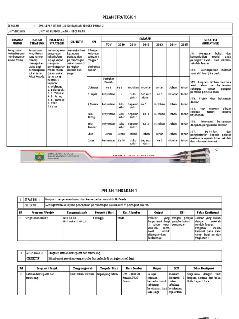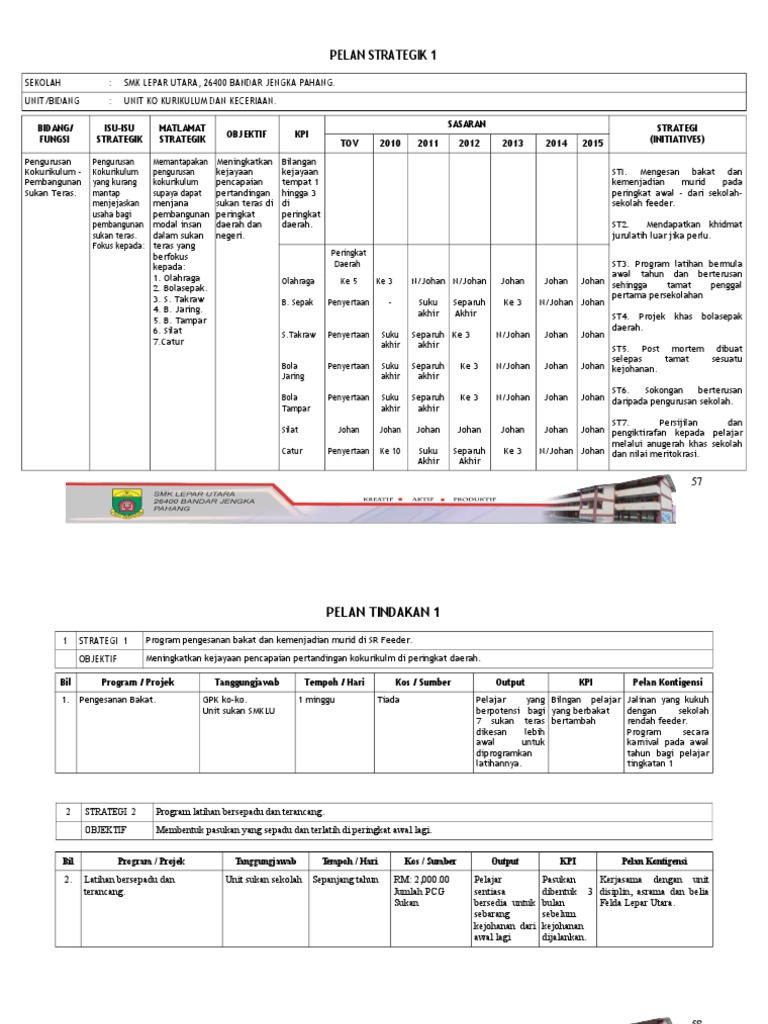 Item yang perlu di isi dalam perancangan strategik sekolah. Pasukan spm 2017 > . Perancangan strategik kokurikulum kelab pengguna. Dapat persetujuan pibg dan minta kerjasama pibg. Perancangan strategik sksp 2010 2015 93 pelan operasi nama projek : Perancangan strategik kelab bola baling 2011. Pencapaian johan, naib johan dan meningkatkan 1. Teks ucapan guru besar hari. Sekolah kebangsaan pusat chabang tiga. Buku perancangan strategik ini dihasilkan dengan tujuan membolehkan para pendidik sekolah ini terus melaksanakan segala program akademik yang dirancang ke arah pencapaian wawasan negara dengan lebih berkesan. Bahan pelan pembangunan pendidikan malaysia. 2.2 mewujudkan kelengkapan kokurikulum yang mencukupi untuk keperluan semua pelajar. Oleh itu, perancangan strategik unit kelab dan persatuan ini diharapkan dapat menjadi garis panduan bagi menjayakan sebarang aktiviti yang berkaitan dengan unit kelab dan persatuan di sekolah ini pada masa akan datang.